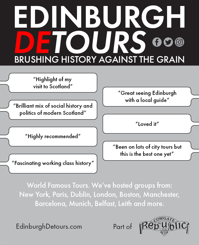 Edinburgh Detours is a not-for-profit educational organisation raising awareness of Edinburgh’s social history and architectural heritage through guided tours and events.